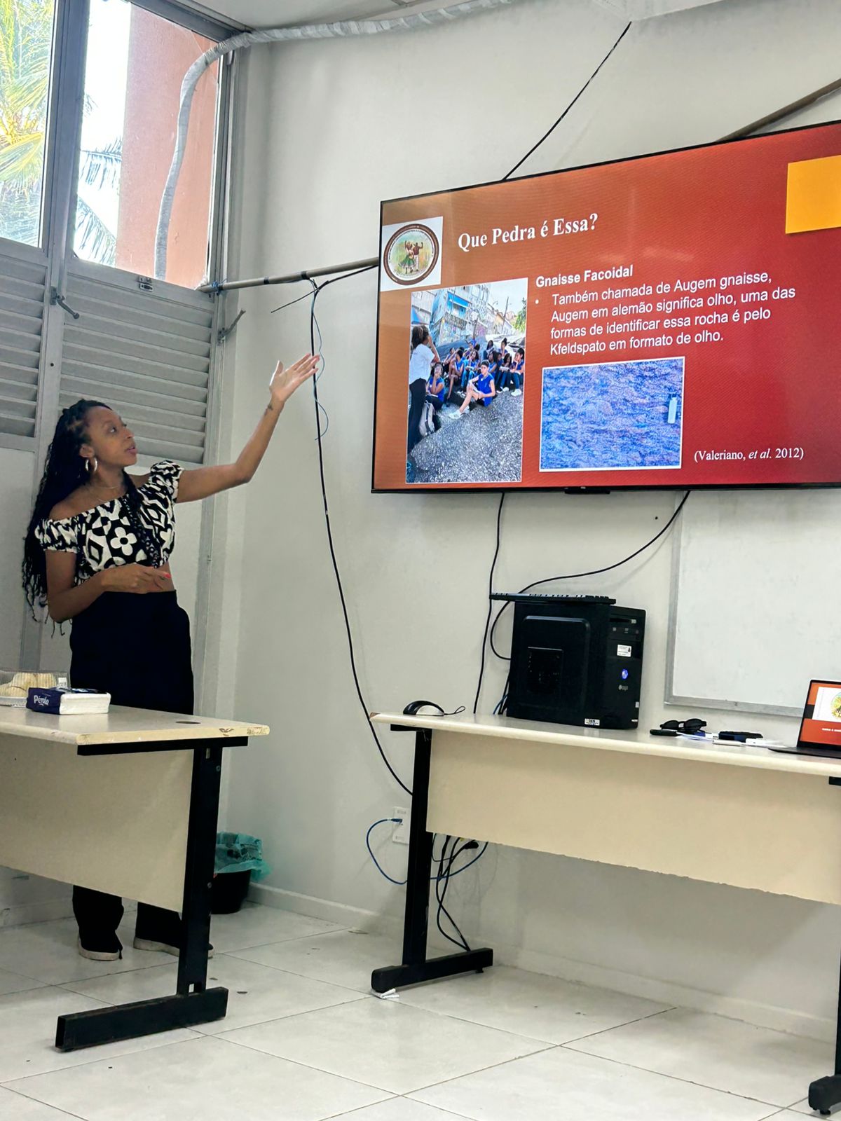 Durante o congresso, Larissa integrou a Sessão Temática 7, onde apresentou o trabalho Geodiversidade em territórios negros: como o ensino de geologia pode contribuir na luta antirracista”, desenvolvido em parceria com a geóloga Marize Muniz, também pesquisadora do IGA.